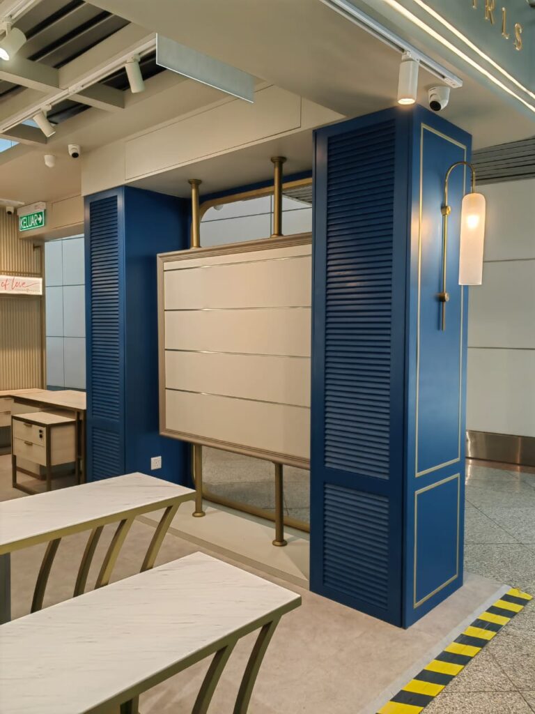 The design concept for Little Malaysia at Kuala Lumpur International Airport blends traditional Malaysian culture with a black-and-white neoclassical aesthetic. The kiosk features clean lines, symmetrical shapes, and understated ornamentation, creating a sophisticated backdrop for the display of local souvenirs. Traditional Malaysian patterns are subtly etched or inlaid into surfaces, adding cultural depth to the monochromatic theme without overwhelming the design. Strategic lighting highlights each item’s beauty, offering an inviting and culturally rich shopping experience for travelers. This thoughtful blend of modernity and tradition ensures the space is both elegant and authentically Malaysian.