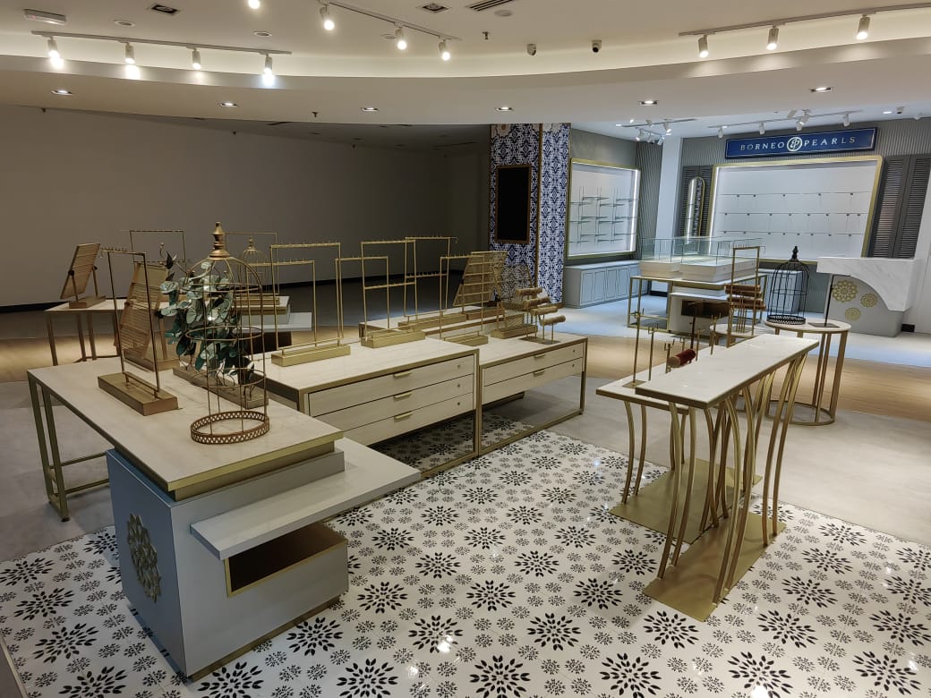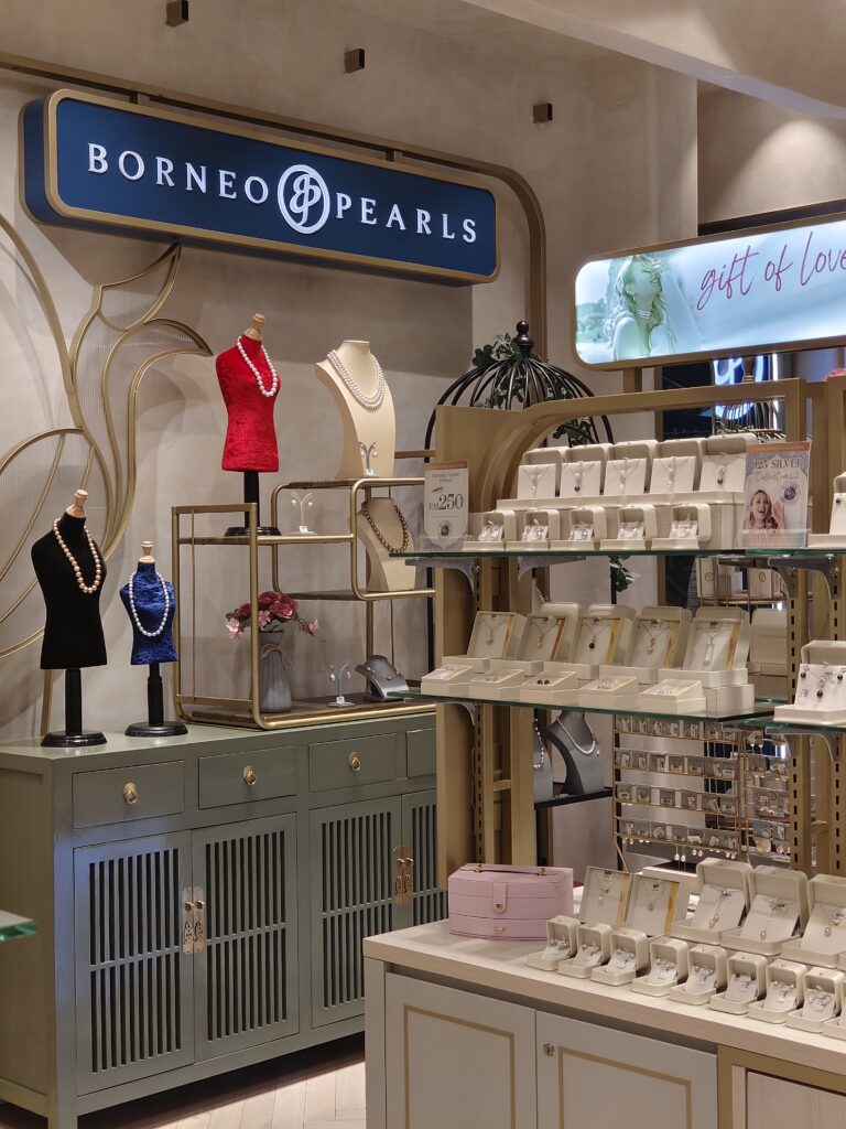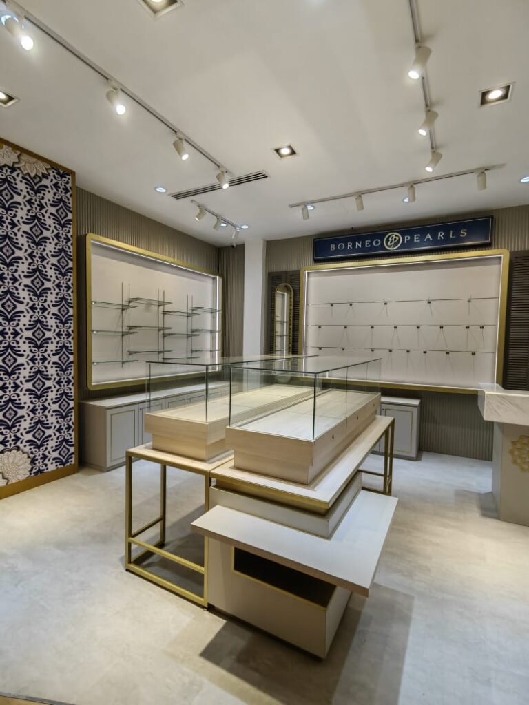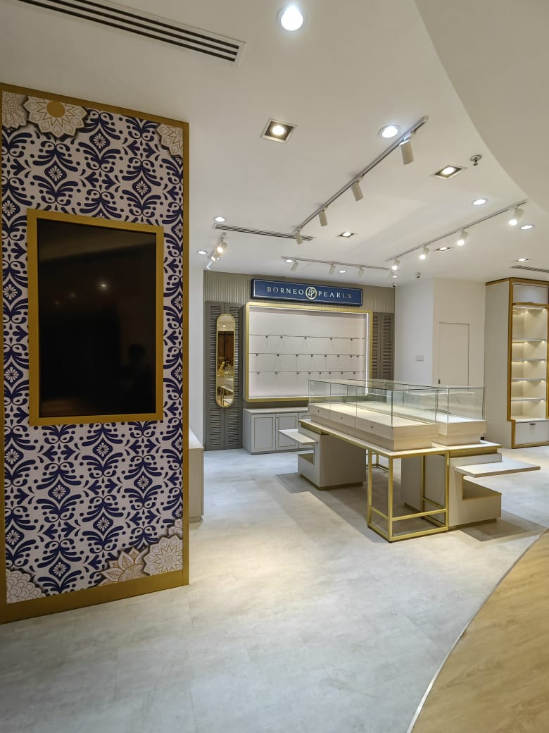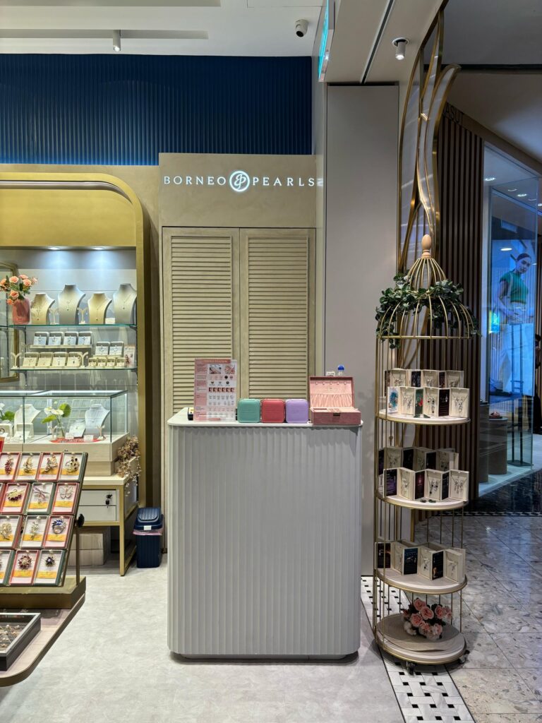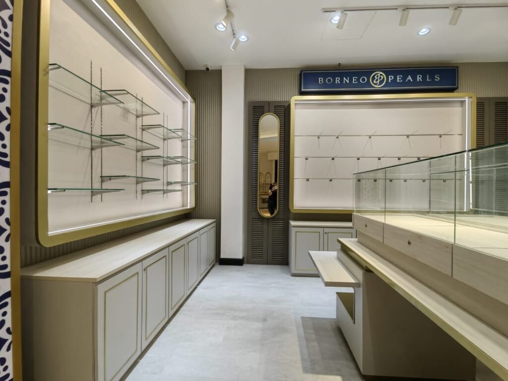 The Borneo Pearls Retail Store at Sunway Pyramid maximizes its small space with a modern classic design, creating an elegant and inviting atmosphere. Subtle motifs add a timeless touch of femininity, enhancing the store’s sophisticated aesthetic. Warm, carefully positioned lighting highlights the beauty of each product, ensuring the displays are both captivating and functional. Despite its compact size, the store exudes luxury and comfort, offering a refined shopping experience.