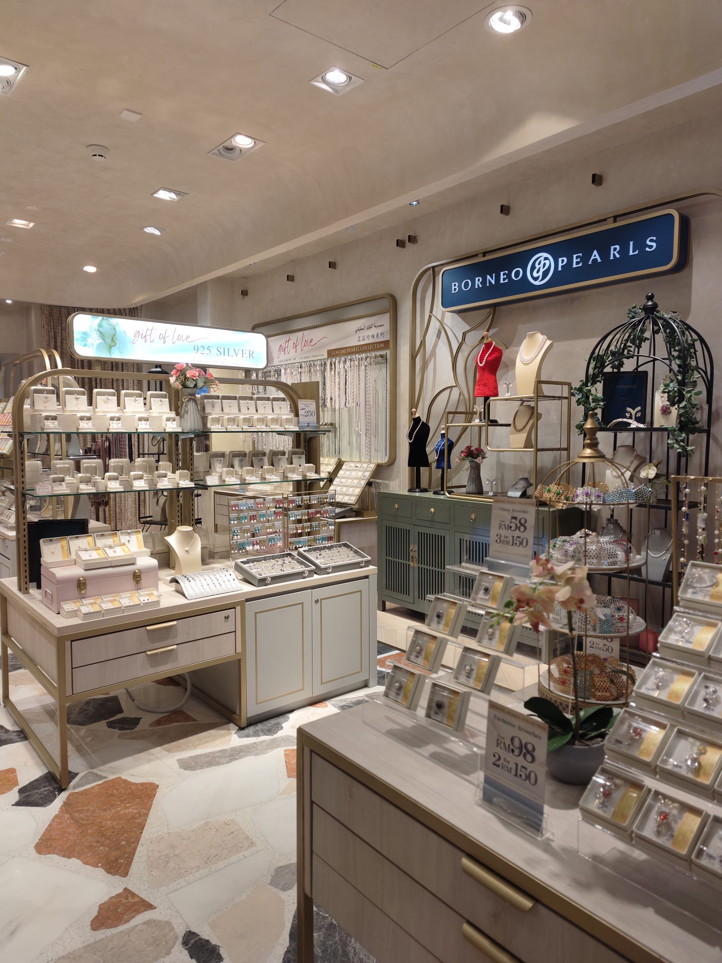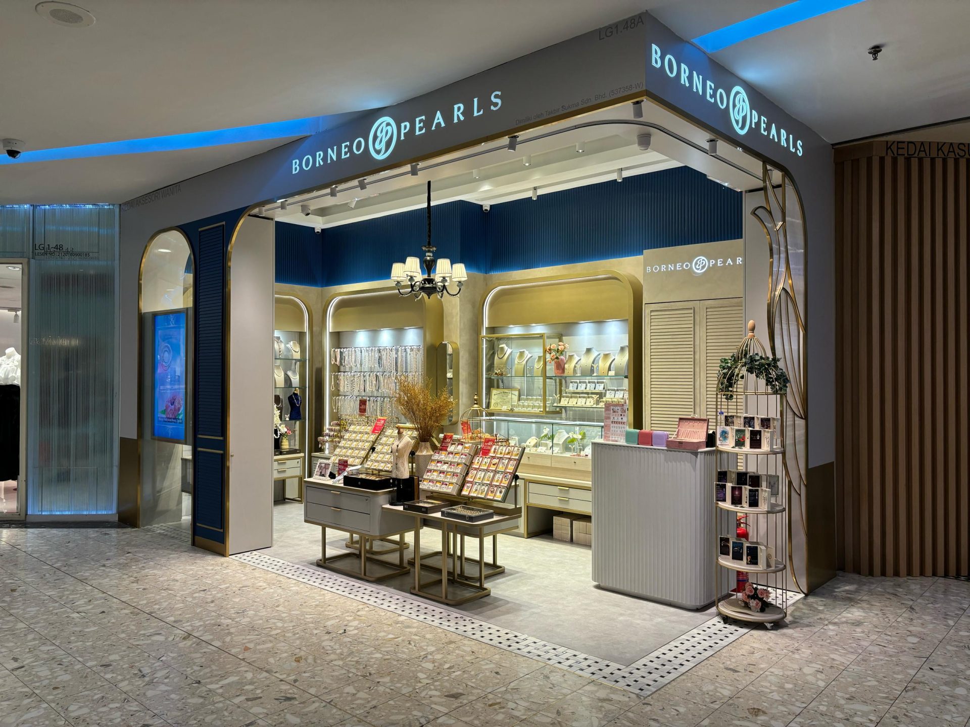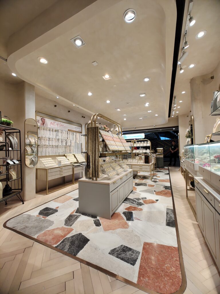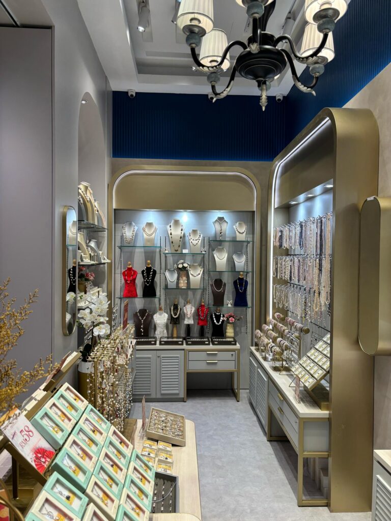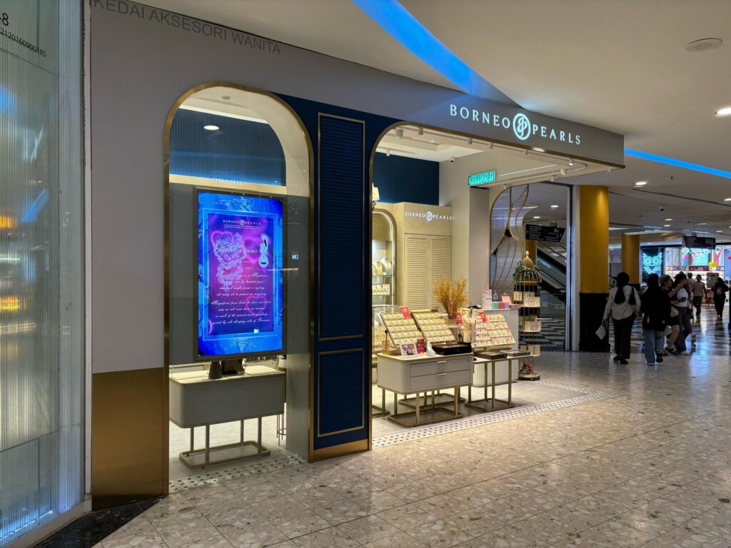 The Borneo Pearls Retail Store at Sunway Pyramid maximizes its small space with a modern classic design, creating an elegant and inviting atmosphere. Subtle motifs add a timeless touch of femininity, enhancing the store’s sophisticated aesthetic. Warm, carefully positioned lighting highlights the beauty of each product, ensuring the displays are both captivating and functional. Despite its compact size, the store exudes luxury and comfort, offering a refined shopping experience.