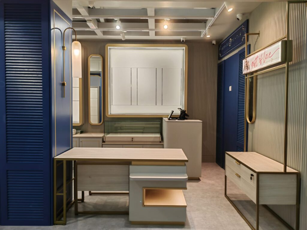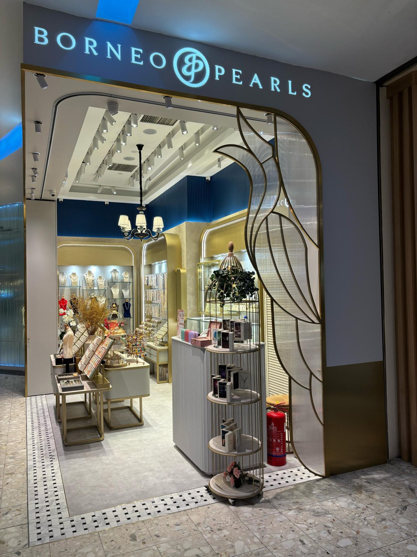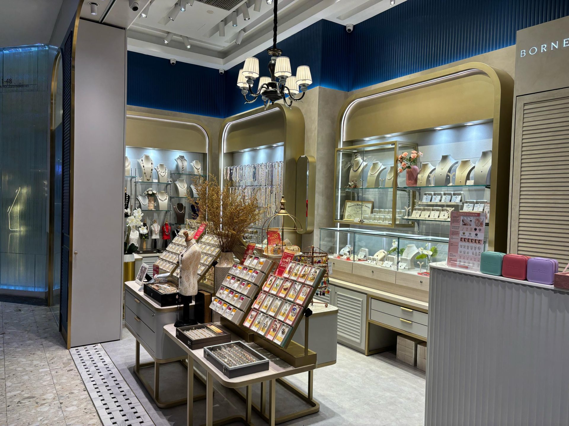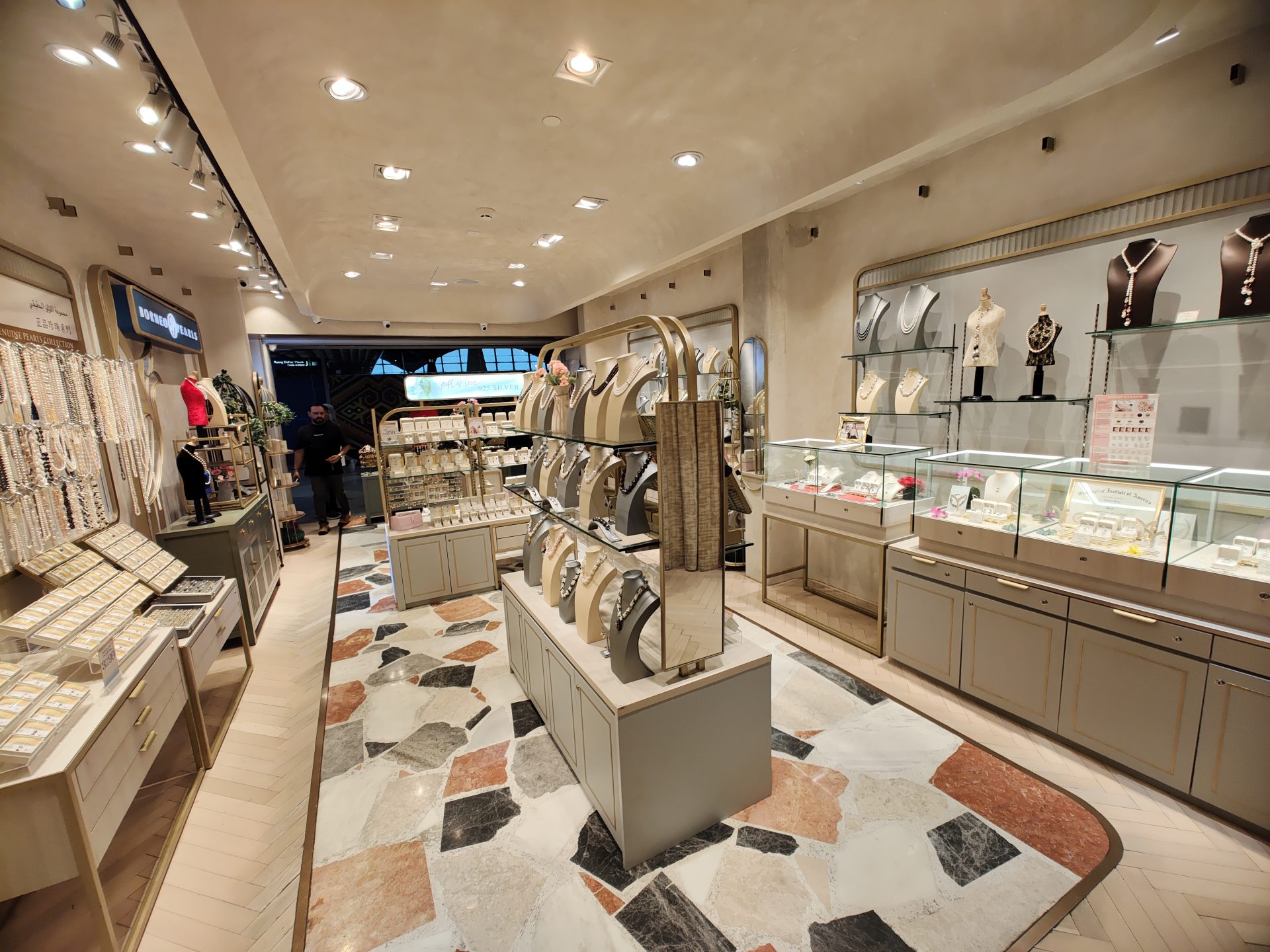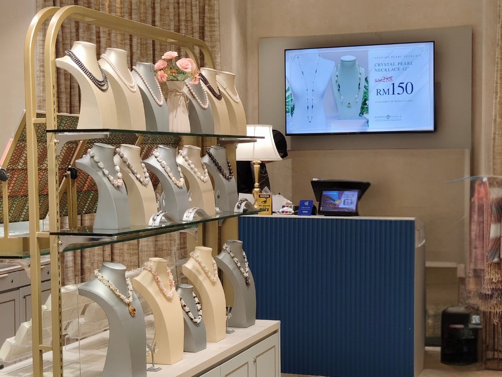 The Borneo Pearls Retail Store at Sunway Pyramid maximizes its small space with a modern classic design, creating an elegant and inviting atmosphere. Subtle motifs add a timeless touch of femininity, enhancing the store’s sophisticated aesthetic. Warm, carefully positioned lighting highlights the beauty of each product, ensuring the displays are both captivating and functional. Despite its compact size, the store exudes luxury and comfort, offering a refined shopping experience.