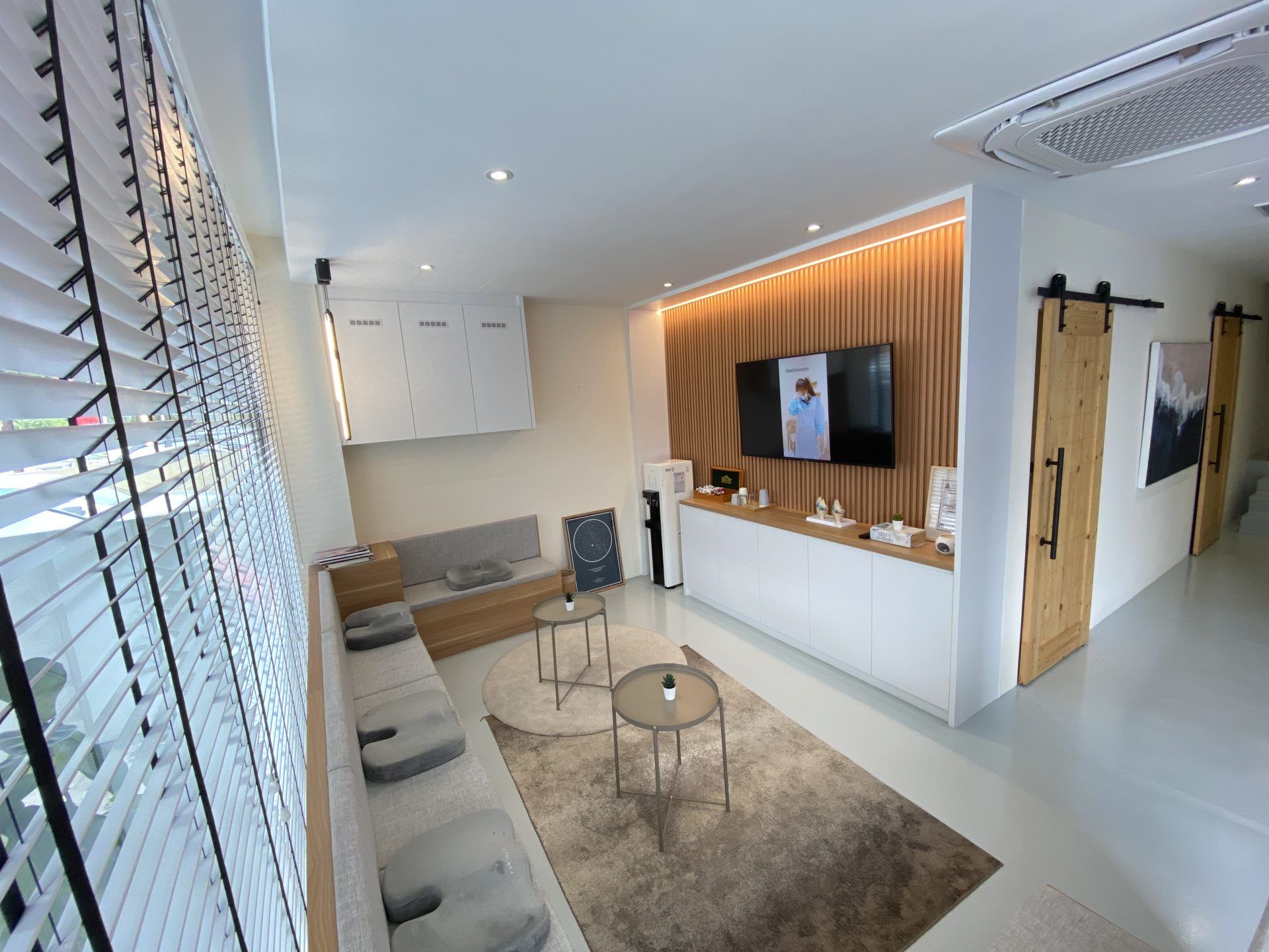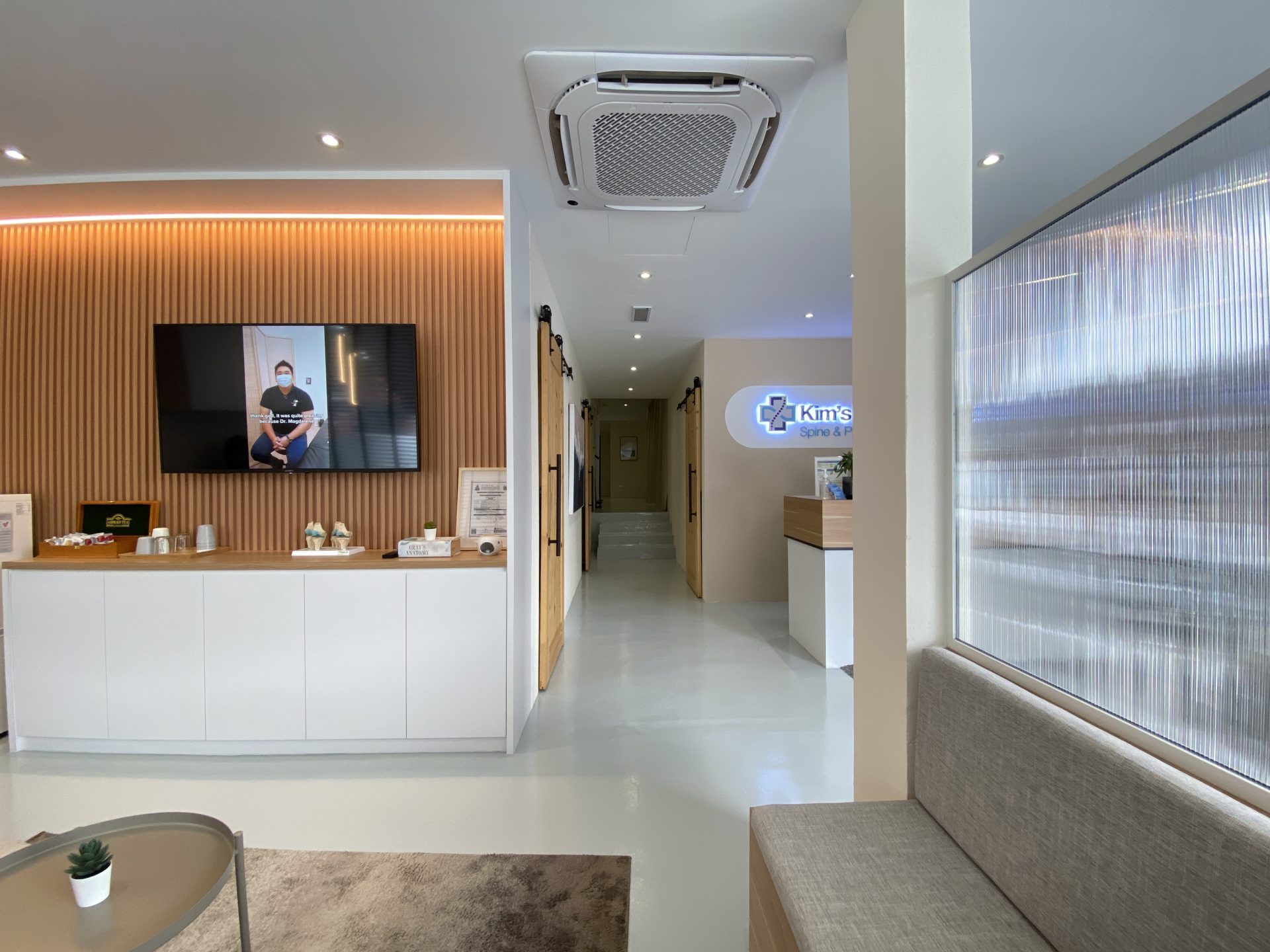 Kim’s Chiropractic Center emphasizes not only high-quality care but also a soothing, nature-inspired environment for its clients. Earthy tones, rooted in nature, are used throughout to create a calming atmosphere. Wood finishes are featured from the front desk to the waiting lounge and treatment rooms, reinforcing the natural, tranquil theme. Soft lighting complements the design, further enhancing the relaxing and welcoming ambiance for clients and their guests, ensuring a holistic, comfortable experience.